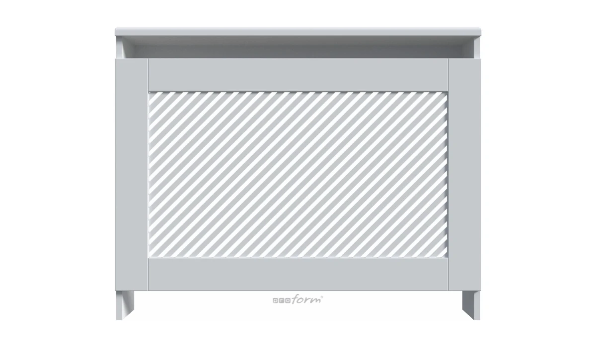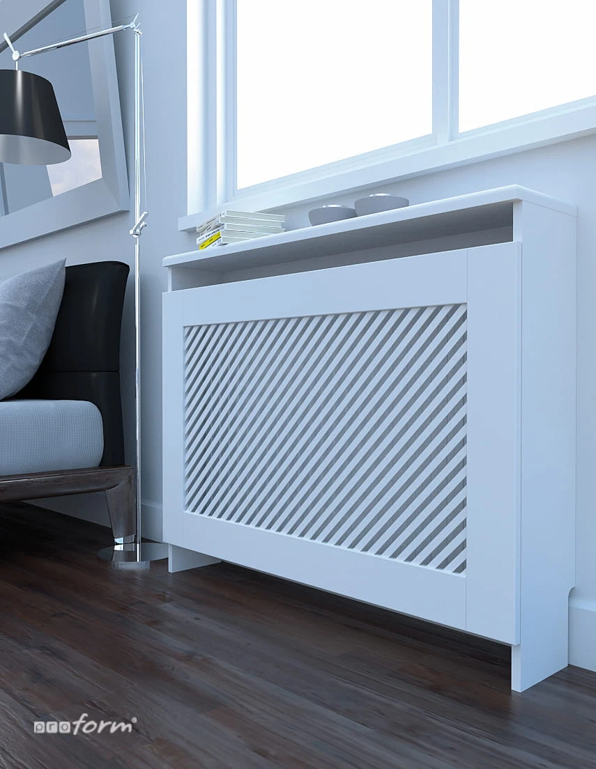 Maskownica do kaloryferów ze wzorem ukośnych frezowanych pasków Modern Line idealnie wpisuje się w wystrój wnętrza dzięki prostocie wzoru i możliwości wyboru dowolnego koloru lakierowania maskownicy. Osłona grzejnika Modern Line zapewni wysokiej klasy aranżację i podkreśli wyjątkowy charakter wnętrza. Obudowa zastosowana w maskownicy grzejnikowej gwarantuje solidny wygląd i łatwy montaż.