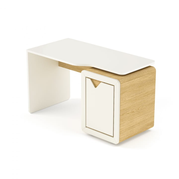 Biurko oryginalne i zapadające w pamięć - wyróżnia go ciekawa forma blatu oraz boczny, obrotowy kontenerek - możliwość dowolnej rotacji kontenerka względem blatu, co podnosi funkcjonalność mebla.