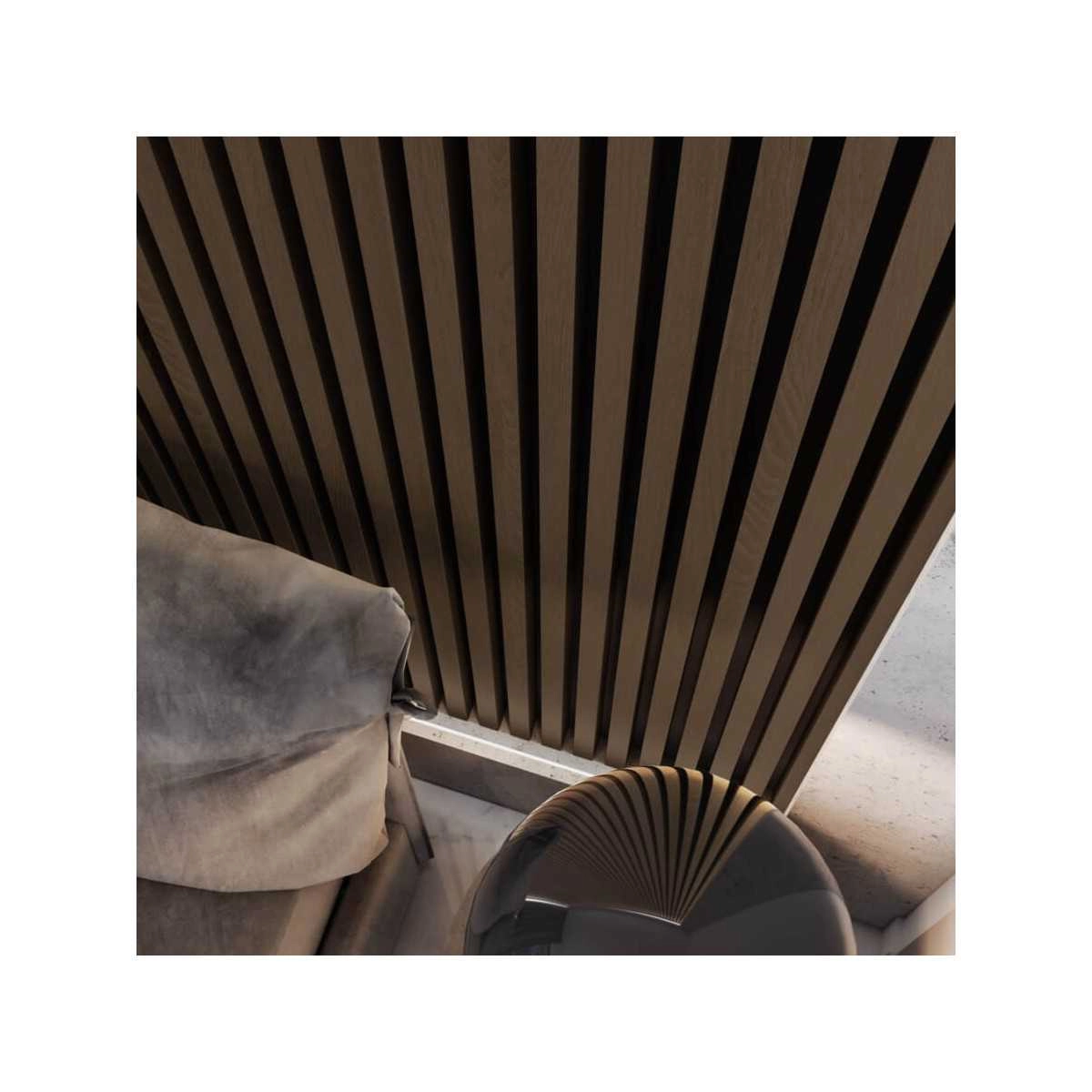 Pakiety lameli na podkładzie akustycznym filcowym o grubości 8 mm to 6 listewek w kolorze orzecha na gotowym do montażu 30-centymetrowym panelu.
