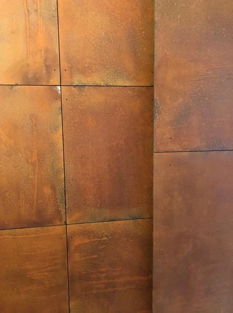 - rdza industrialna z przebarwieniami i/lub zaciekami - jej kolor wynika z procesu naturalnego utleniania, jednak kolorystyka oraz wzór są celowo różnicowane, by dać efekt bardziej surowej, nieregularnej rdzy z licznymi przebarwieniami, z możliwością uzyskania zacieków i wżerów; jednocześnie zachowujemy stosunkowo płaską/gładką powierzchnię zabezpieczoną matowym lakierem, aby panele nadal były łatwe w utrzymaniu w czystości