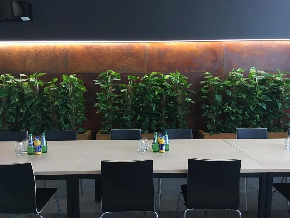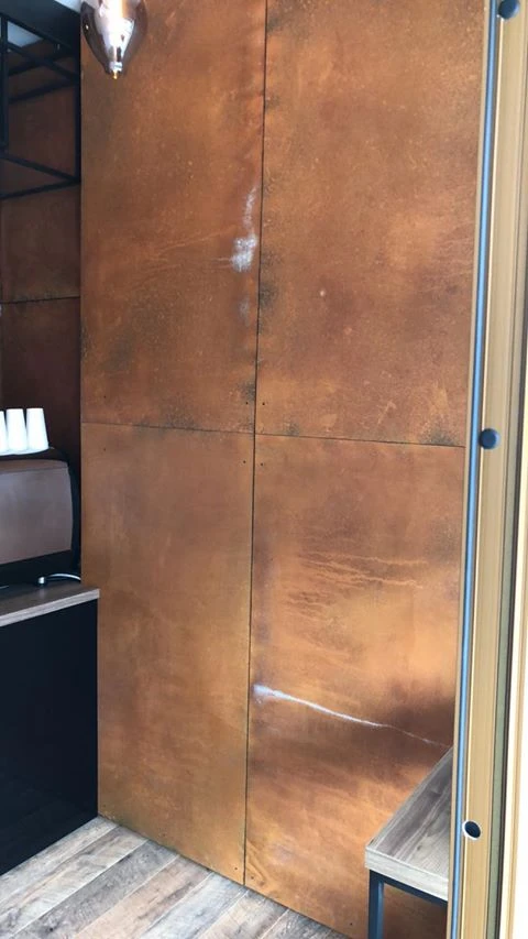 Panele ścienne imitują zardzewiałe płyty stalowe, zachowując przy tym stronę praktyczną - panel wykonano z lekkiej płyty nośnej, pokrytej efektem i impregnowanej lakierem matowym, dla zachowania trwałości i walorów użytkowych.