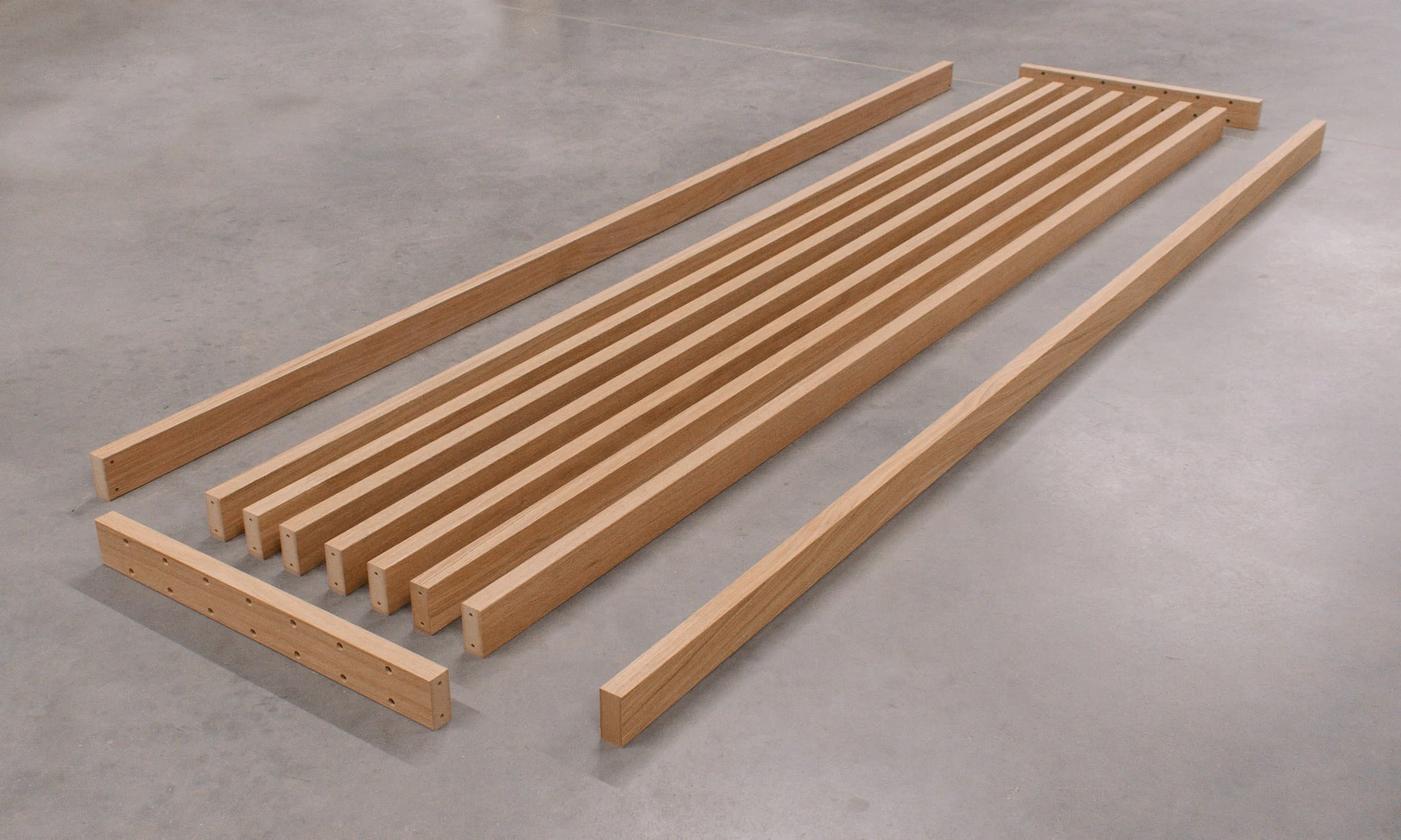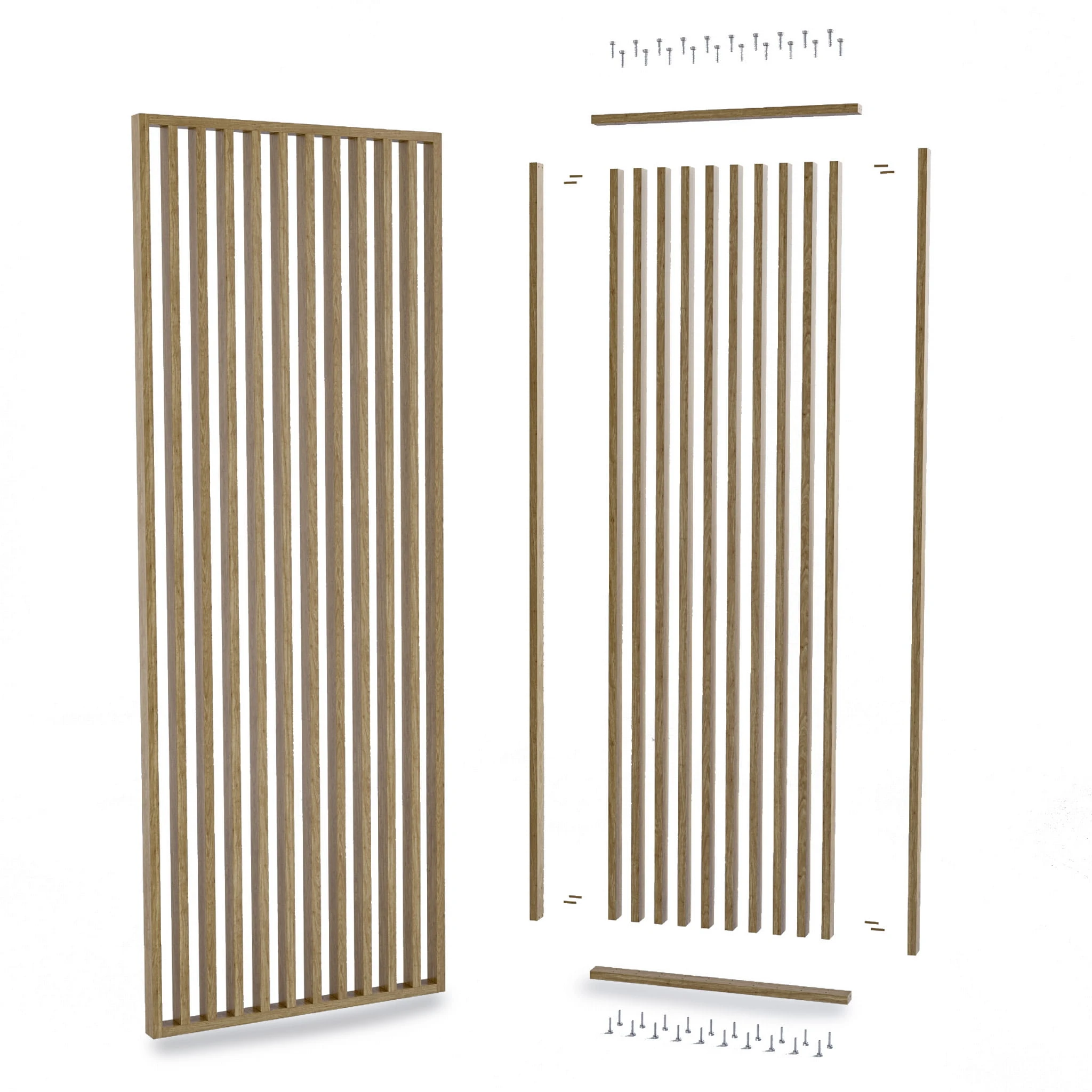 Komplet składa się z lameli pionowych o przekroju 3 x 7 cm oraz dopasowanych listewek górnej i dolnej o tym samym przekroju. Odległość pomiędzy pionowymi lamelami wynosi 5 cm i tak są przygotowane otwory montażowe w listwach zamykających całość.