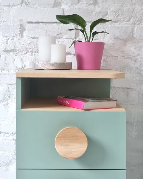 Jej pojemne szuflady z drewnianymi uchwytami zapewniają łatwy dostęp do przechowywanych przedmiotów, a dodatkowa półka o szerokości 70 cm idealnie pasuje do miłośników książek. Szafka nocna dostępna jest w 18 kolorach, a elementy drewniane można wybarwić na dąb, orzech, czerń lub biel. Dzięki cichemu domykaniu szuflad oraz opcji wykonania otworu na kable, Dabi jest praktycznym, a jednocześnie estetycznym meblem, który doskonale współgra z łóżkiem Dabi, tworząc spójną przestrzeń w stylu boho.