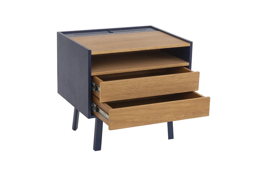 Szafka nocna DIAMENT to elegancka i funkcjonalna opcja do każdej sypialni, wykonana z forniru dębowego oraz lakierowanej płyty MDF. Wyposażona w dwie szuflady o pełnym wysuwie, półkę oraz ukryty schowek, zapewnia mnóstwo miejsca na przechowywanie rzeczy, które chcesz mieć zawsze pod ręką.